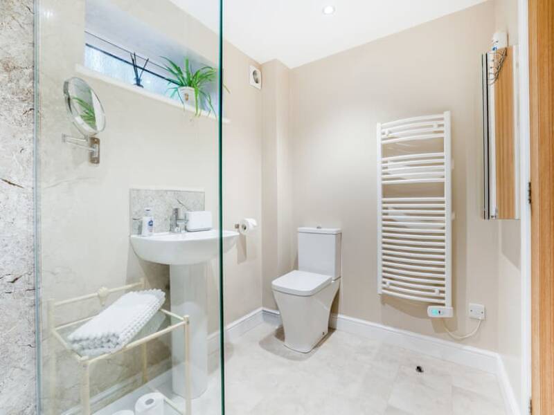 Bathroom including walk-in shower (with rainfall and flexible shower heads) and heated towel rail